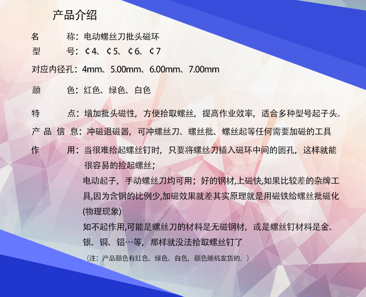 增加批頭磁性,方便吸取螺絲,提高工作效率,適合多種型號起子頭。